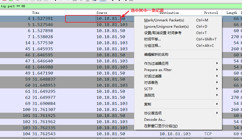 示例: 查看ip为10.18.81.50的客户端,向本地端口号为88服务器发送的数据包