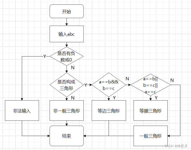 #include<stdio.h> void main() { int a,b,c; printf("请输入三角形得三条边:\n"); scanf("%d",&a); scanf("%d",&b); scanf("%d",&c); if(a+b>c&&a+c>b&&b+c>a) { if(a<=0||b<=0||c<=0) printf("非法输入"); if(a==b&&a==c&&b==c) printf("等边三角形"); else if(a==b||a==c||b==c) printf("等腰三角形"); else printf("一般三角形"); } else printf("非一般三角形!"); }