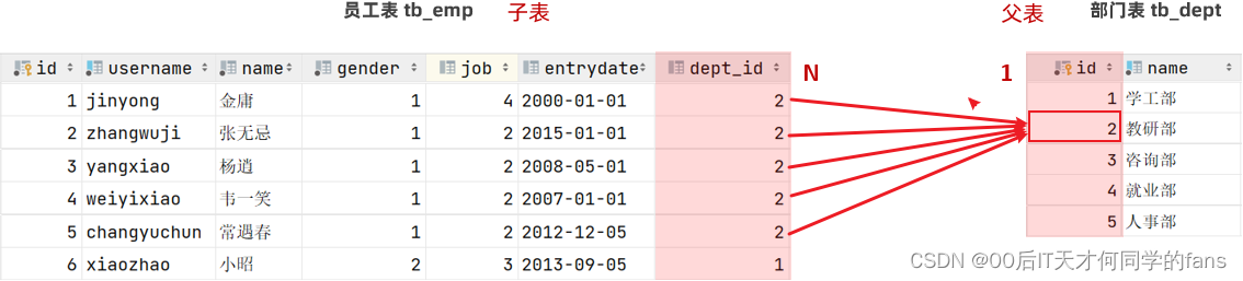 显然,部门和员工就是一种一对多的关系,因为一个部门下是会有多个员工的,但是一个员工只能归属于一个部门,其实这种关系,就是一对多的关系。在这种关系当中,由于一个部门对应多个员工,所以我们把部门叫一的一方,把员工叫多的一方。所以,在一对多的关系当中,我们把一的一方叫做父表,把多的一方叫子表,因为一个父亲可以有多个儿子。因为一个父亲可以有多个儿子,但是一个儿子只能有一个父亲。