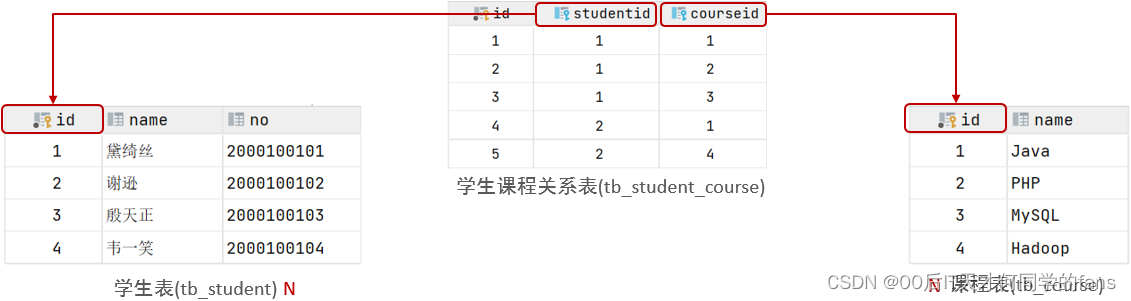 studentid用来关联的是学生表的主键,而courseid关联的是课程表的主键