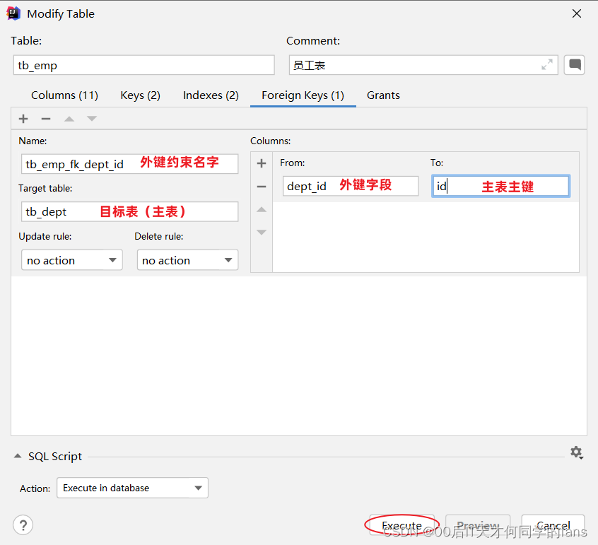 - 如果是在创建表的时候添加外键,我们只需要在所有字段都罗列完成之后,后面加上这么一个约束,指定关键字constraint,指定外键约束的名称,然后指定外键的关键字foreign key,在小括号里面来指定哪个字段是外键,对于我们当前来说dept_id这个字段就是一个外键字段,然后再通过references来指定它所关联的主表{父表}的字段,这个主表指的就是我们刚才所介绍的父表,这是在创建表的时候指定。