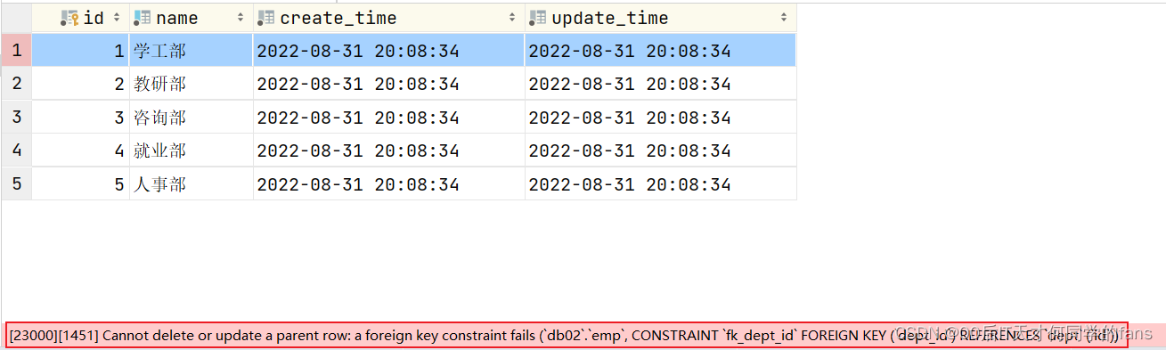 当我们添加了外键之后,再删除ID为1的部门,就会发现,此时数据库报错了,不允许删除。