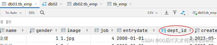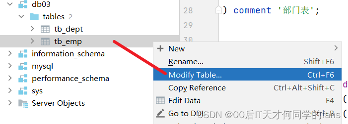 部门表创建好之后,我们还需要再修改下员工表。为什么要修改员工表呢?是因为我们之前设计员工表(单表)的时候,并没有考虑员工的归属部门。