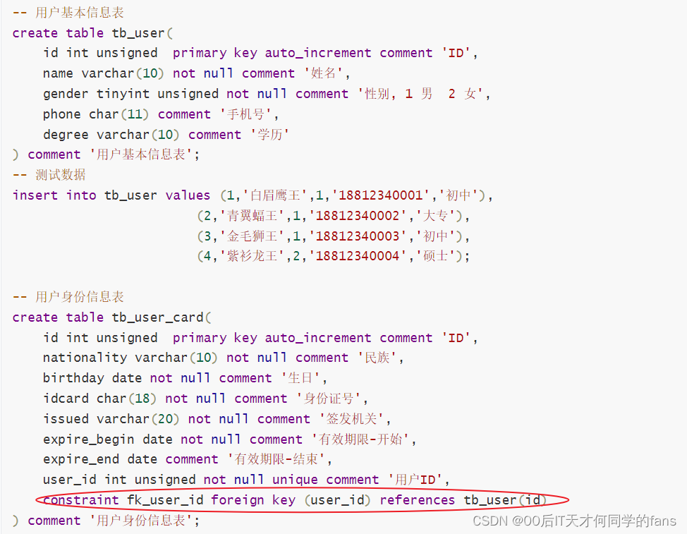 - 为了保证它们之间是绝对的一对一的关系,可以为该外键字段再加上一个unique唯一约束,此时就会保证这一列的值是不会重复的,这样也就保证了一个用户不能对应两个身份证。