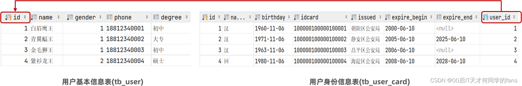 - 如果在业务系统当中,对用户的基本信息查询频率特别的高,但是对于用户的身份信息查询频率很低,此时出于提高查询效率的考虑,我就可以将这张大表拆分成两张小表,第一张表存放的是用户的基本信息,而第二张表存放的就是用户的身份信息。他们两者之间一对一的关系,一个用户只能对应一个身份证,而一个身份证也只能关联一个用户。