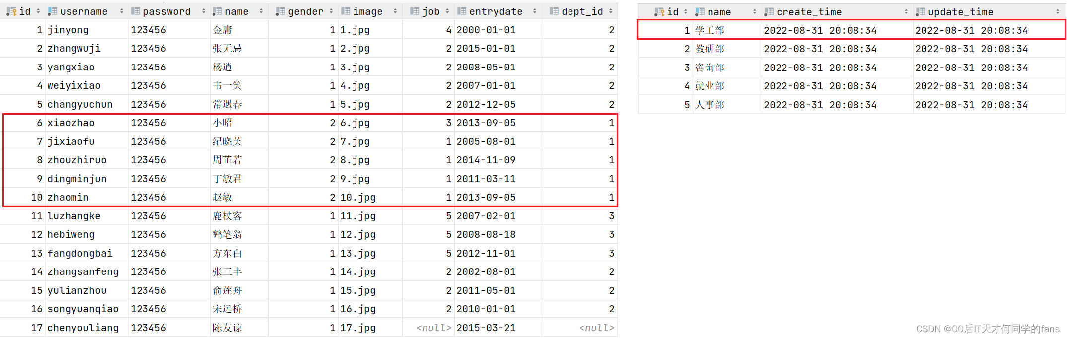 现在员工表中有五个员工都归属于1号部门(学工部),当删除了1号部门后,数据变为: