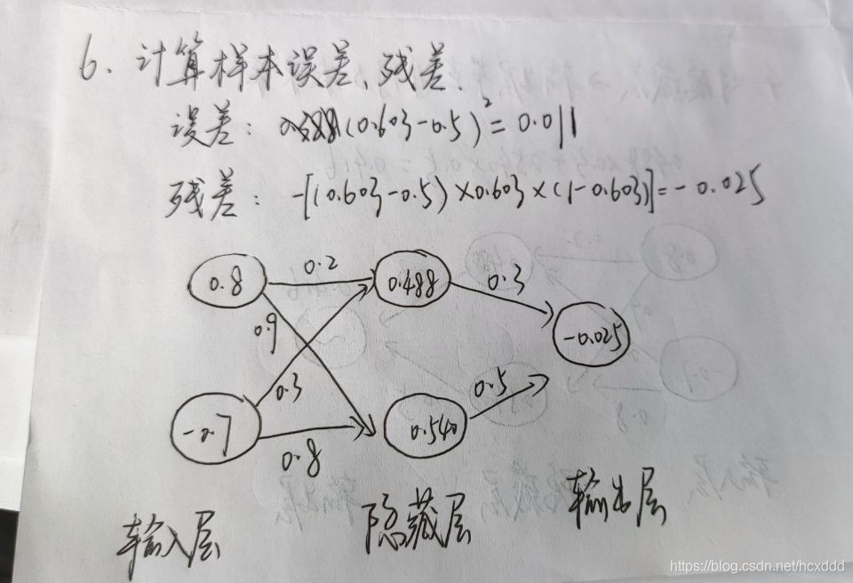 输出层→隐藏层:残差 = -(输出值-样本值) * 激活函数的导数