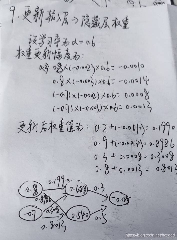3.如此一层一层的向后传下去(隐藏层间偏导加权求和),直到输入层(不计算输入层)。