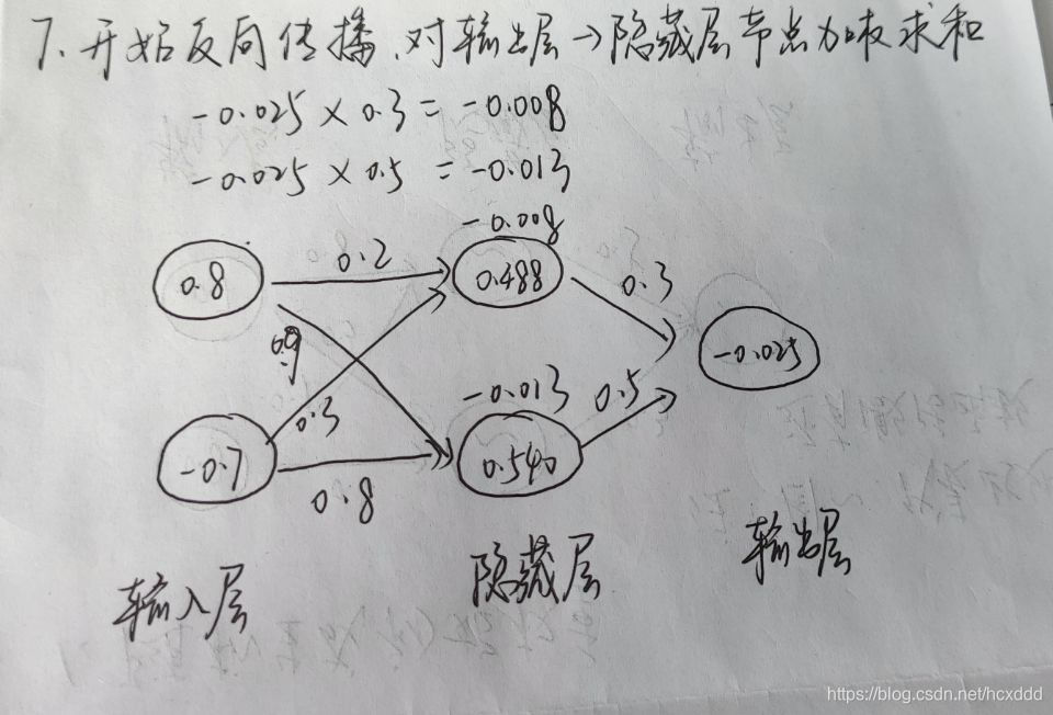 2.再用这个偏导数和前面的隐藏层进行加权求和。