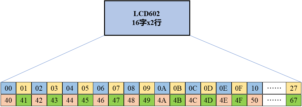 LCD1602液晶又被称作1602字符型液晶,这是一种只用来显示字母、数字、符号等的点阵型液晶模块。LCD1602里面存储器一般有三种:CGROM、CGRAM、DDRAM。其中DDRAM(Display Data RAM)就是显示数据RAM,用来寄存待显示的字符代码。共80个字节,其地址和屏幕的对应关系如下如图所示: