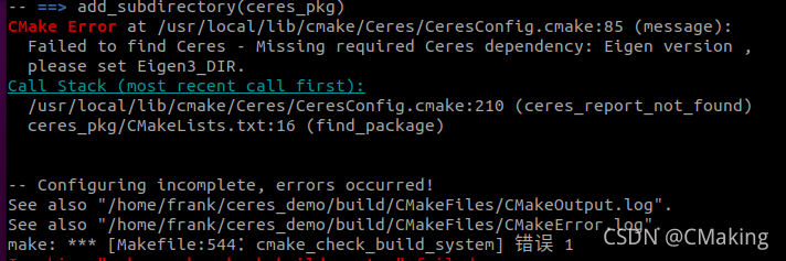 错误1:Failed to find ceres - Missing required ceres dependency: Eigen version ,please set Eigen3_DIR.
