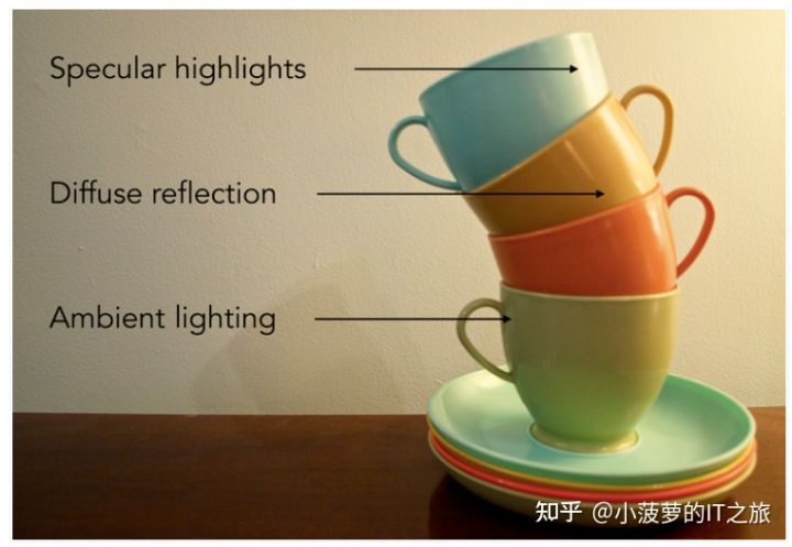 - 「高光」:物体完全反射光源照射到表面的光照到人眼(即镜面反射)