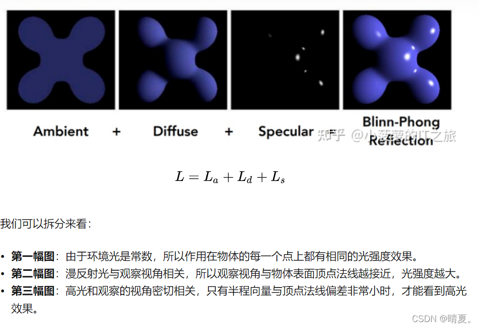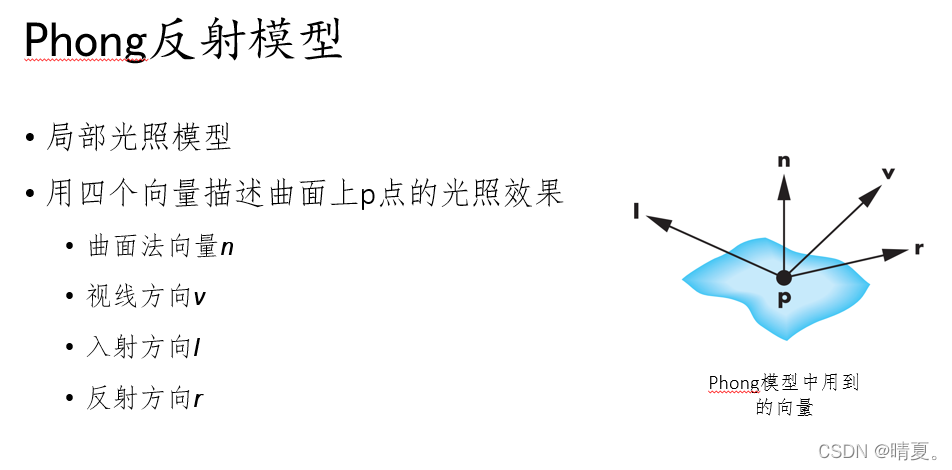 Phong反射模型考虑了光线和材质之间的三种相互作用:环境光反射、漫反射和镜面反射,最终在三维物体表面上的每个点的颜色由这三个成分组合表示如下。