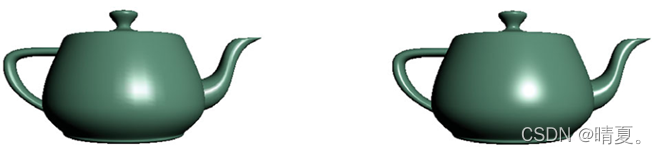 如下图所示,左边是采用逐顶点的光照计算的效果,右边采用逐片元光照计算的效果,从结果上来看,因为逐片元计算会对三维物体表面法向量进行差值,从而使得物体表面的法向量场更加均匀,所以产生的光照效果也更加均匀。