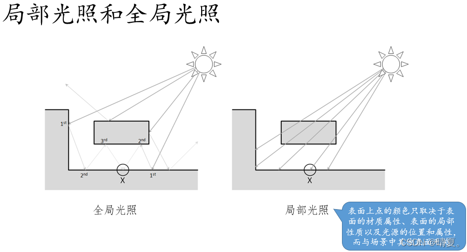 如下图所示,左图中x点接收到周围环境的光线照射表示全局光照,右图中点x接收来自光源的直接照射表示局部光照。
