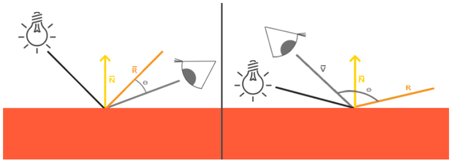 在镜面反射中,我们通过计算出射方向和视点的夹角来确定反射光的强度,在计算机中计算反射向量R的计算量比较大。因此我们可以用其他计算方法近似替代。