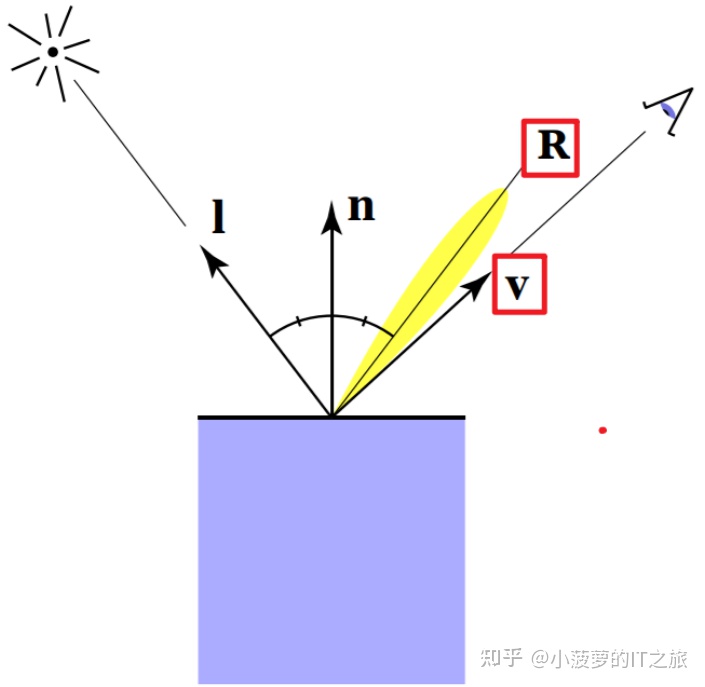 根据生活知识很好理解,当观察方向和反射方向越接近时,光照强度越高,如下图所示