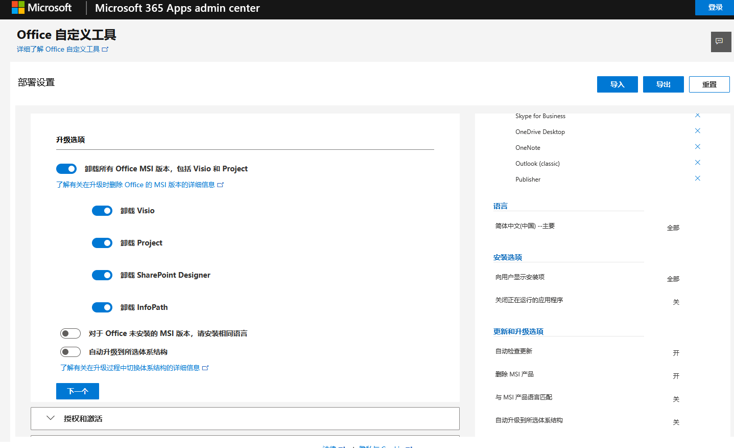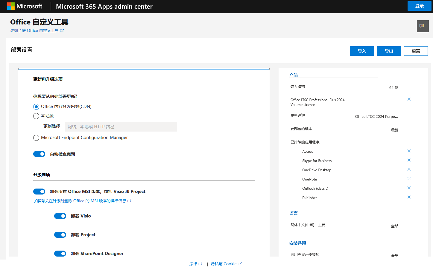 对安装部署方式设定完毕之后进入下一步的更新和升级选项。和上一步对应可选有CDN和本地源。这里默认勾选了删除传统Office MSI版本的选项。以及具体的安装卸载设定。根据需要进行勾选即可。