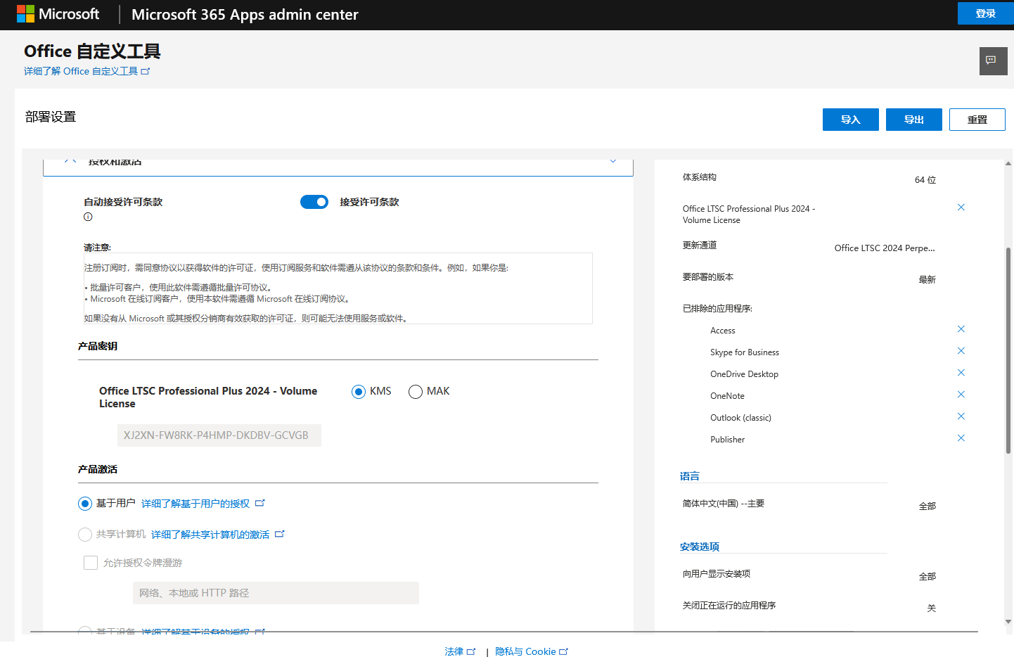 对安装和更新选项设定完毕之后进入授权和激活步骤。以KMS激活方式为例。