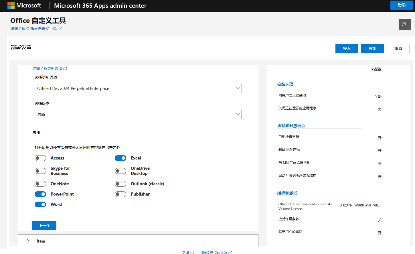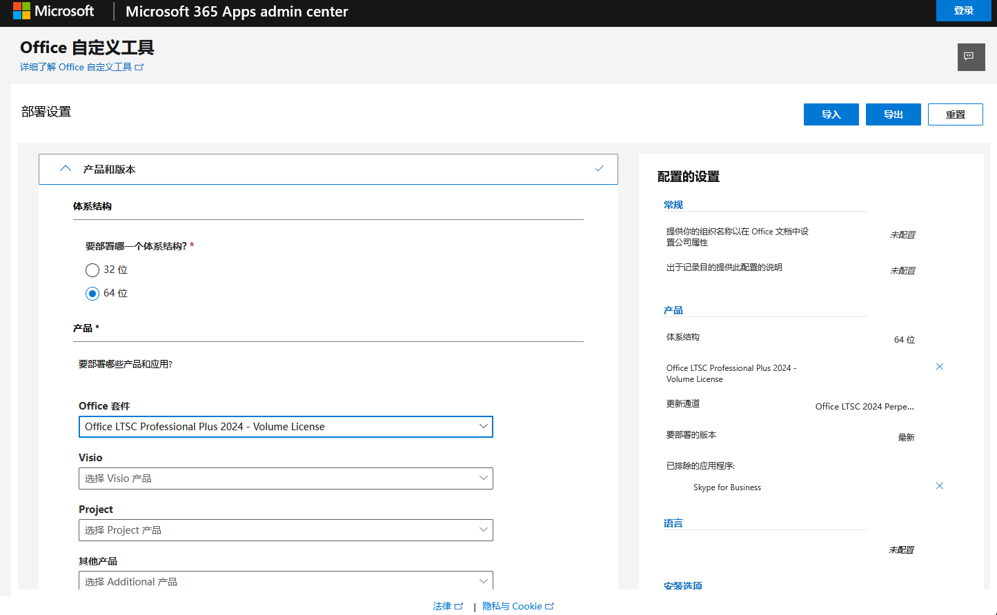 首先左侧选择64位Office,然后在产品一栏中选择要部署的产品和应用下拉菜单,点击添加,之后添加按钮变为更新按钮。右侧栏显示当前的已选择配置。