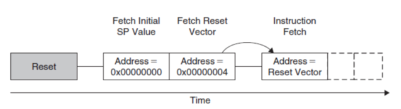 从地址0x0000 0000,取出MSP(主堆栈指针)的值 从地址0x0000 0004,取出复位向量(程序开始执行的地 址, LSB必须是1)