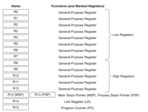 r13 SP 堆栈指针(Process Stack Pointer),保护现场和恢复现场要用,当发生异常的时候,硬件会把当前状态(使用到寄存器数值)保存在堆栈中,SP保存这个堆栈指针,异常处理完成,通过SP出栈,恢复到异常前的状态,有两种堆栈指针MSP、PSP。(Main_Stack_Pointer 和Process_Stack_Pointer)