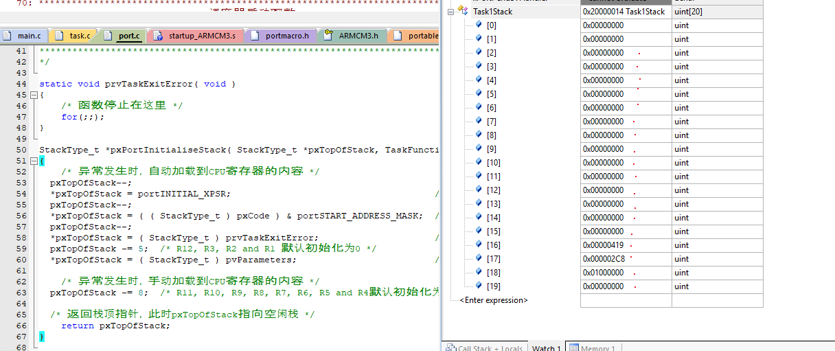 ldr r0, [r1] /* 加载pxCurrentTCB指向的值到r0,目前r0的值等于第一个任务堆栈的栈顶