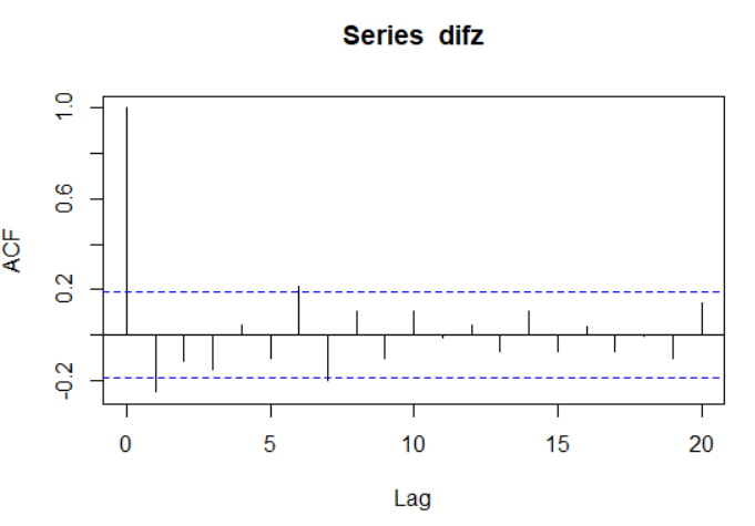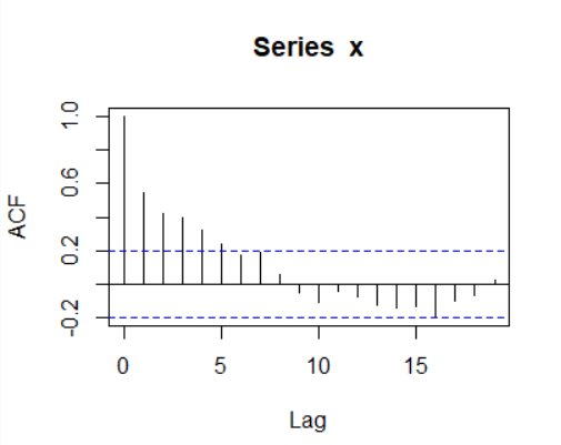 如图,从2阶开始突然全部在二倍标准差区间内,所以具有1阶截尾性。