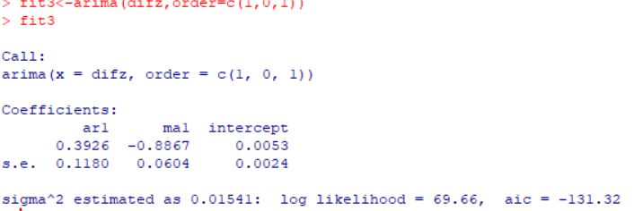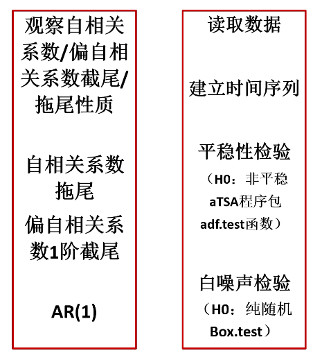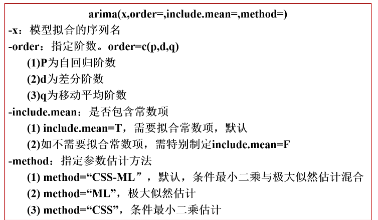 1.计算样本相关系数和偏自相关系数2.模型识别模型定阶的困难样本相关系数的近似分布及模型定阶经验方法例题:2.参数估计常用估计方法:1.矩估计2.极大似然估计3.最小二乘估计R中,参数估计用arima函数例题小结