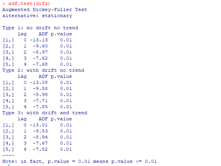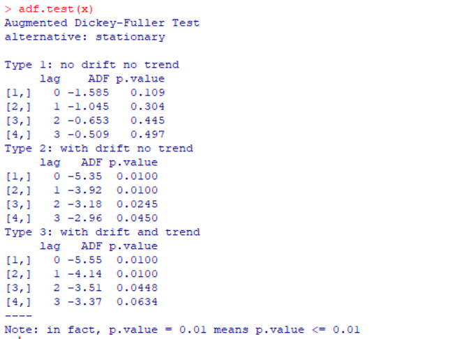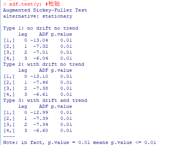 如图,所有类型的p值都小于0.05,所以拒绝原假设,认为它是平稳序列。