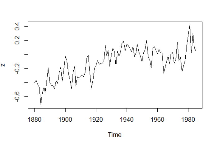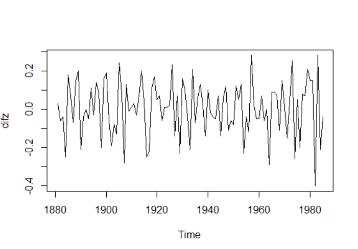 例4-3选择合适的模型拟合1880-1985全球气表平均温度改变值差分序列(表例4-3.csv中全球气表平均温度改变值序列)