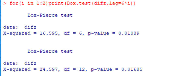 for(i in 1:2)print(Box.test(difz,lag=6*i))