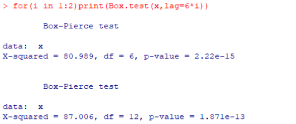 for(i in 1:2)print(Box.test(x,lag=6*i))