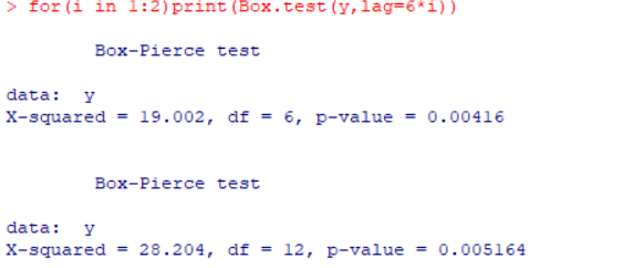 for(i in 1:2)print(Box.test(y,lag=6*i))