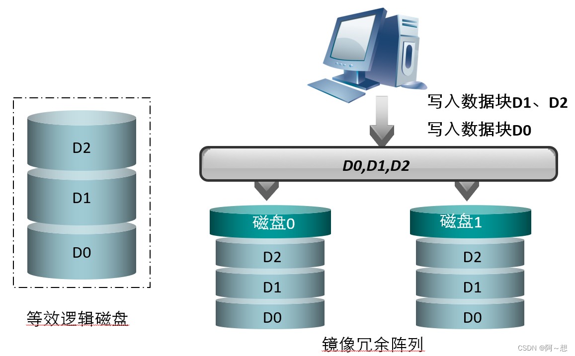 2、RAID1:镜像;至少需要两块盘,每写一次数据就会同时生成一份相同的备份数据(镜像数据),空间利用率50%,读写一般,可靠性高,允许坏一块,常用做系统盘