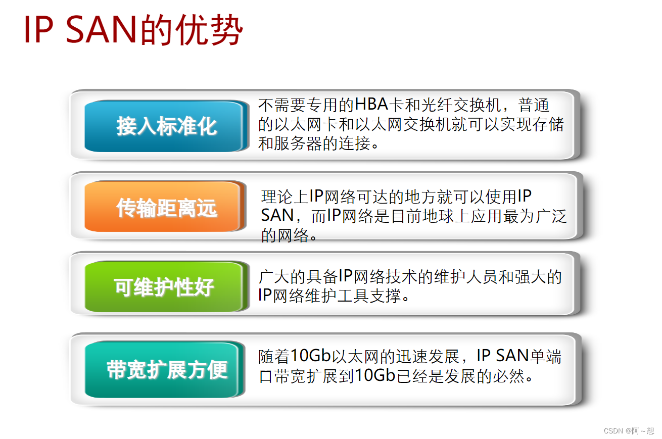 (1)、IP SAN:IP SAN指基于IP协议传输的网络存储系统,其使用标准的TCP/IP协议,可在以太网上进行块数据的传输,无需配置专门的FC网络