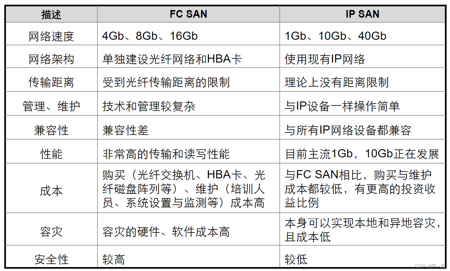 (2)、FC SAN:FC SAN是指使用FC(光纤通道协议)协议的SAN网络。作为SAN网络中第一个成功的千兆位串行传输技术,FC已成为最适合块I/O应用的体系结构;它拥有高速长距离的串行传输;大规模网络应用中的异步通信;较低的传输误码率;较低的数据传输延迟;模块化和层次化结构;传输协议可在HBA上以硬件方式实现,减少对服务器CPU的占用。