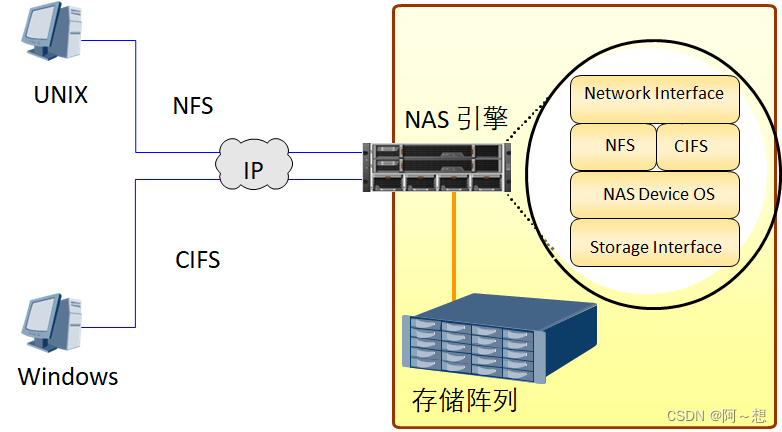 2、NAS:网络附加存储;它基于IP 网络进行数据通信,是一种将分布的、独立的数据进行整合,集中管理数据的存储技术,为不同主机和应用服务器提供文件级存储空间。从使用者的角度,NAS是连接到一个局域网的基于IP的文件共享设备