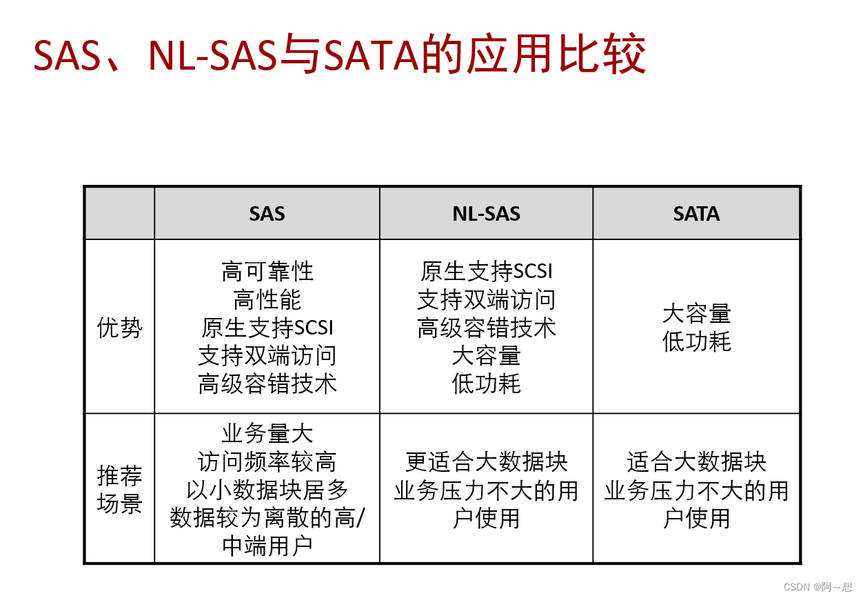 4、NL-SAS:采用了SAS的接口,SATA的盘体,转速只有7200,性能比SAS差,寻址和读取比SATA快
