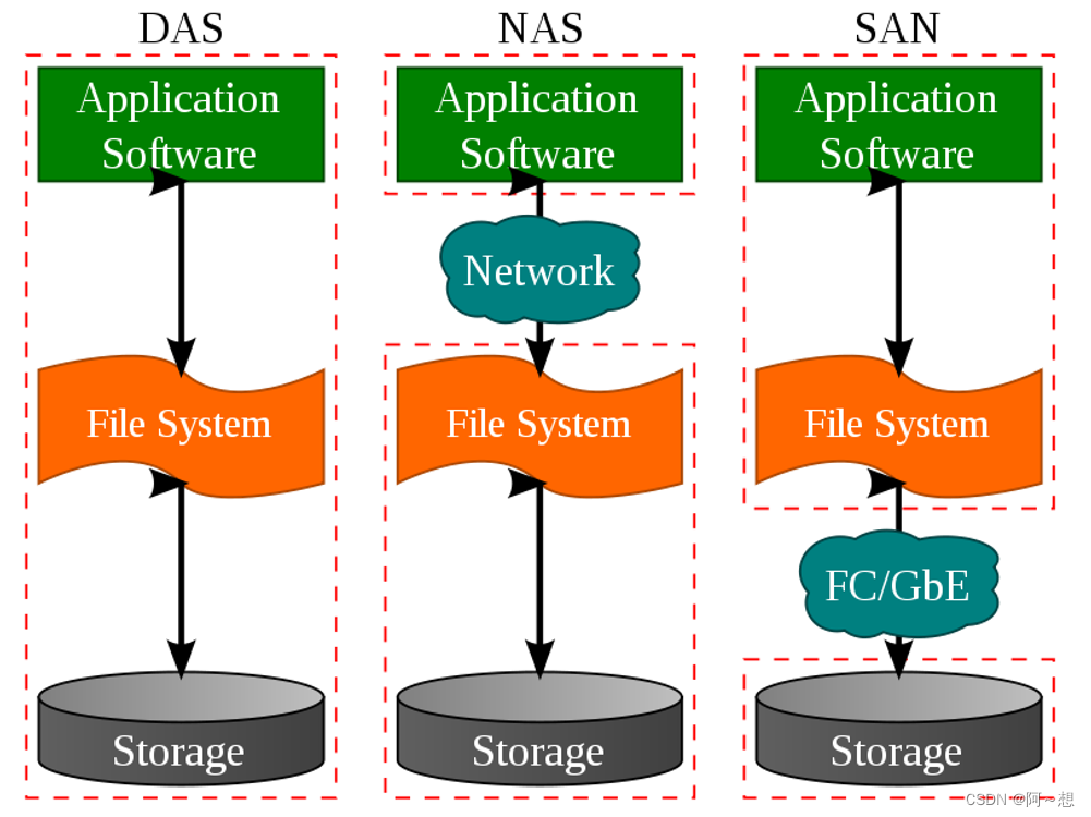 1、DAS:直接连接存储;是一种将存储设备通过电缆直接连接到主机服务器上的一种存储方式。数据存储设备采用SCSI 或FC 协议直接连接在内部总线上,构成整个服务器结构的一部分。