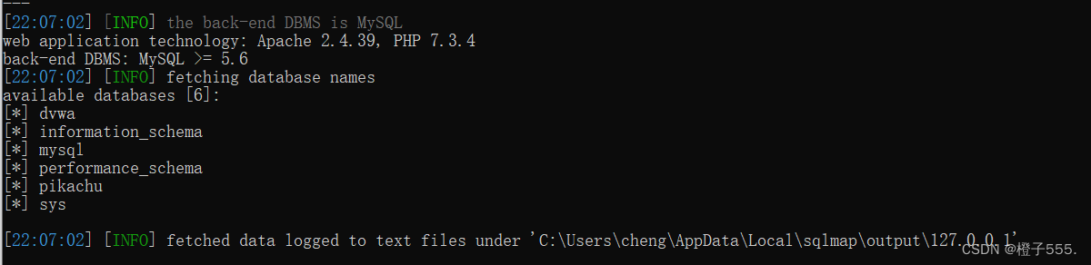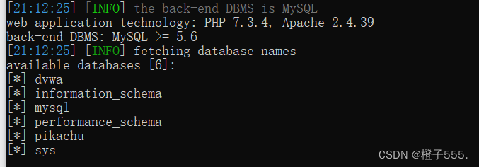 确定数据库类型为mysql后,查看存在的数据库,命令格式为:sqlmap -u 目标网址–dbs
