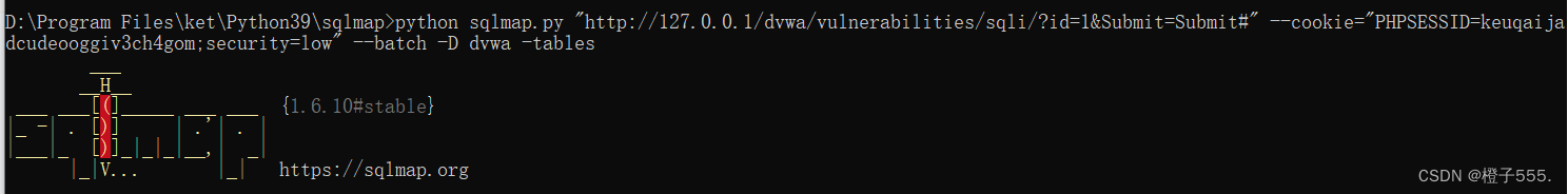 python sqlmap.py "http://127.0.0.1/dvwa/vulnerabilities/sqli/?id=1&Submit=Submit&user_token=f237dc0df1d6cdf589f09179a99fa7aa#" --cookie="security=impossible;PHPSESSID=keuqaijadcudeooggiv3ch4gom" --batch