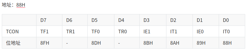 TR1(D6位)、TR0(D4位)这2个位与中断无关,仅与定时器/计数器T1和T0有关,它们的功能将在定时器/计数器一章中介绍。